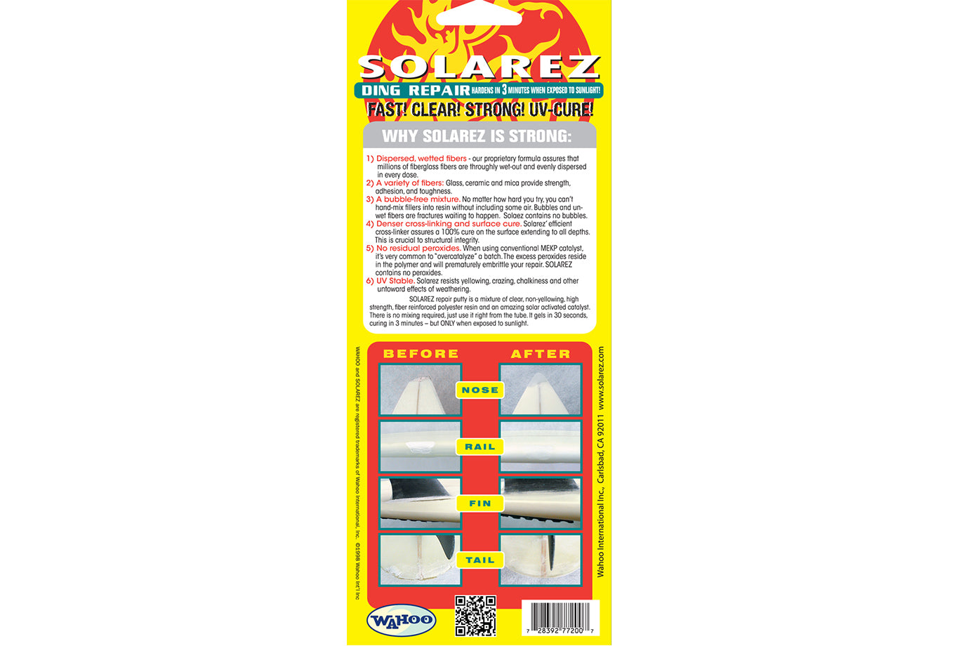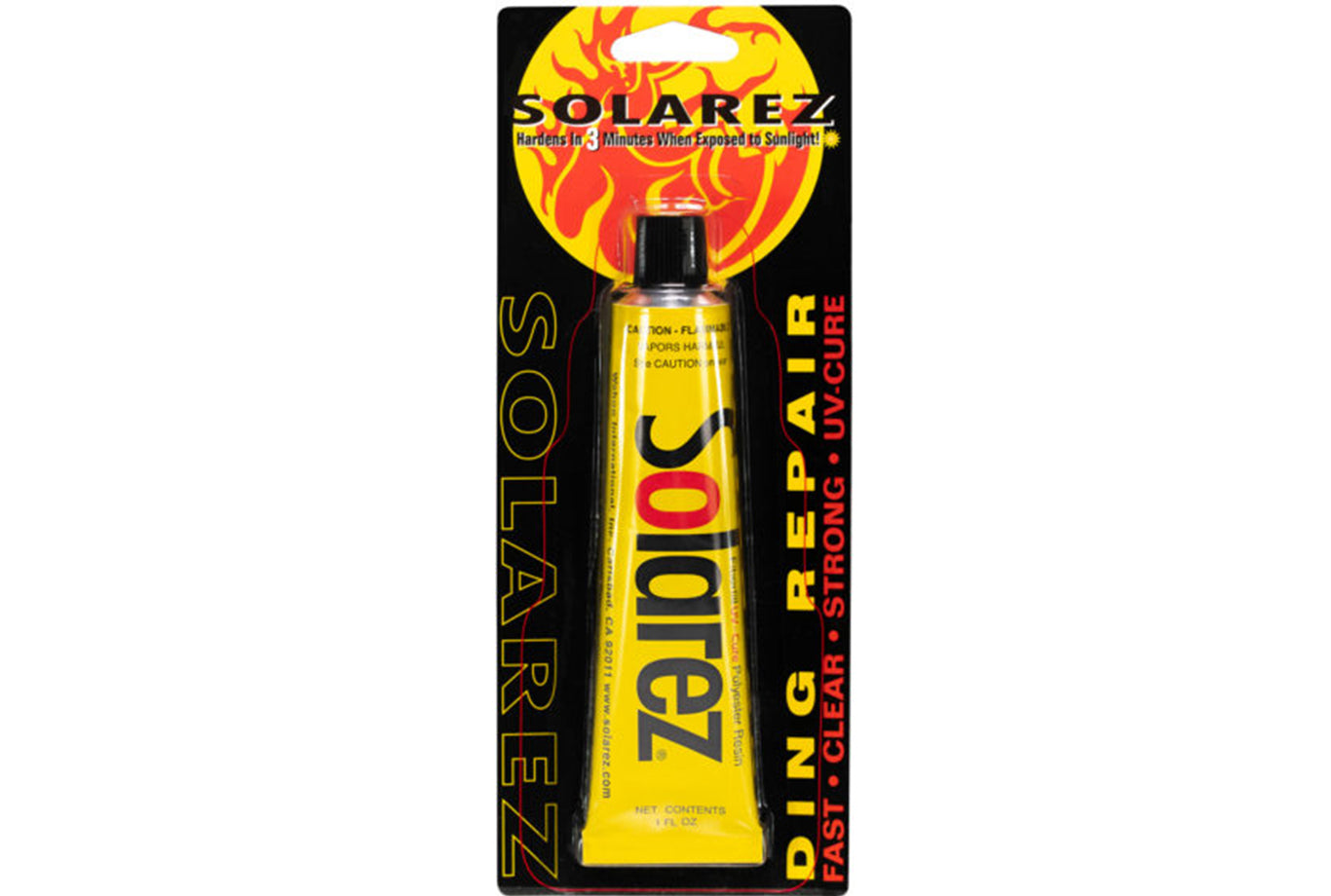 SOLAREZ repair putty is a mixture of clear, non-yellowing, high strength, fiber reinforced polyester resin and an amazing solar activated catalyst. There is no mixing required, just use it right from the tube. It gels in 30 seconds, curing in 3 minutes – but ONLY when exposed to sunlight.