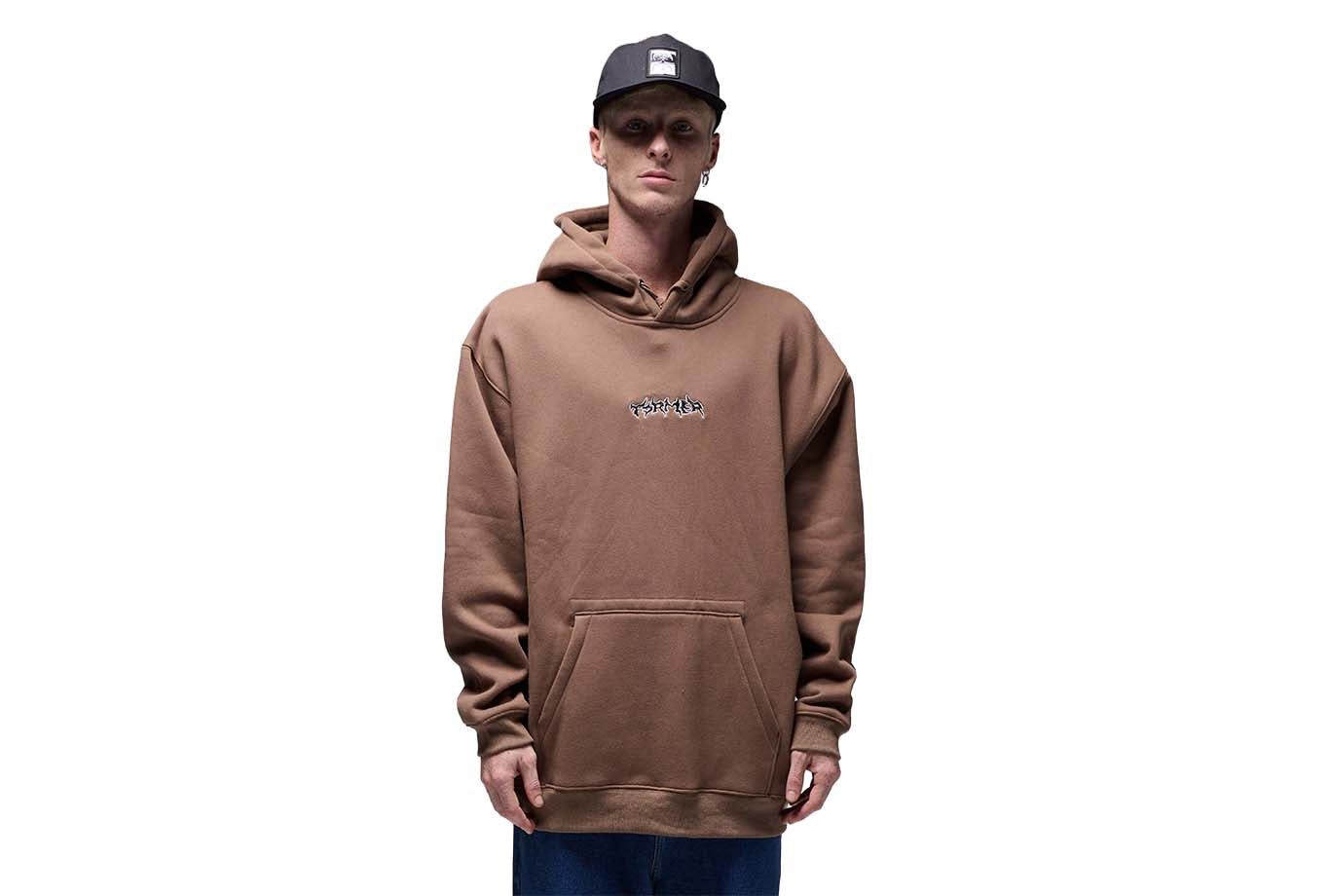 Designed in a premium 320GSM cotton faced brushed fleece with 50% cotton 50% poly for warmth and comfort, and delivered in our standard FORMER hood fit. Featuring drawcord closure with FORMER branded metal aglets, front graphic embroidery, Franchise F logo embroidery on hood, kanga pocket with military stitch detail and internal woven label, and double hood lining.