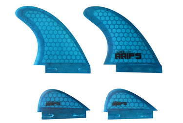 Two lead fins have 4.25” height, 4” base, two “Nibster" trailing fins are double foiled with 1.62” height, 3.81” base.