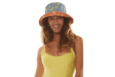PRINTED CANVAS BUCKET HAT THAT IS REVERSABLE. SHE HAS TRAPUNTO STITCHING AROUND HE BRIM.