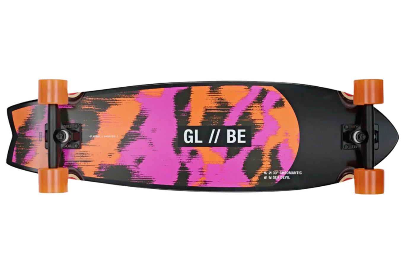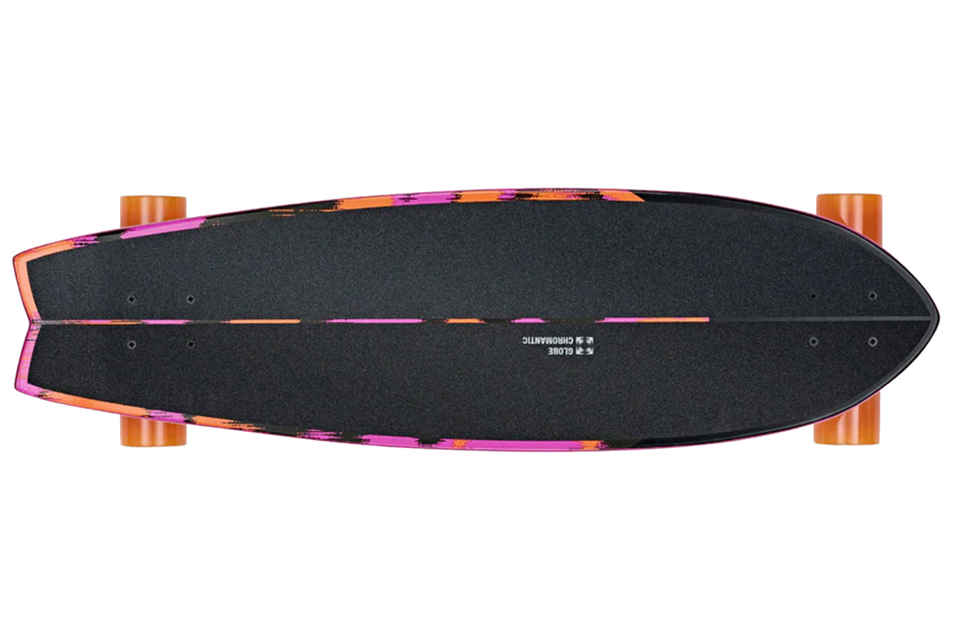 The Chromantic - Sea Devil is a mid-length swallow-tail cruiser, 33" x 9.5" x 22.25" wb constructed from Resin-7 hard rock maple with mellow concave and kicktail, rolling on 78a conical cruiser wheels and Tensor trucks.