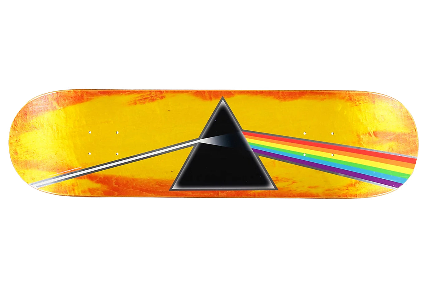 Having a deep impact on American culture, Pink Floyd joins forces with Habitat Skateboards to offer the Sunburst Dark Side Of The Moon 8.25" skateboard deck to commemorate the classic album from 1973. The co-branded board's bottom ply showcases the iconic rainbow prism album cover artwork - outlined by silver foil detailing to add a flashy accent to the limited edition collector's item.